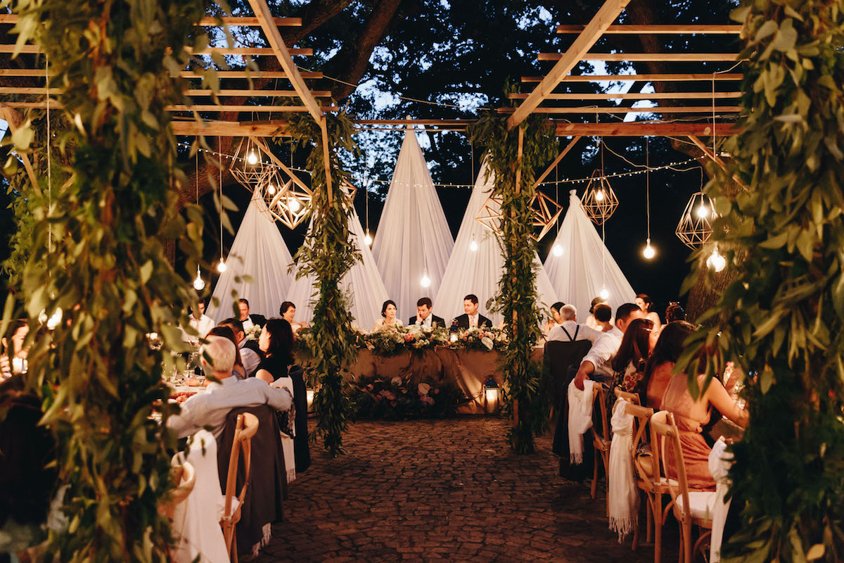 Nooitgedacht luckily provided us with space and scope to do just that and the guests happily “travelled” from one section to the next. The ceremony was held on the lawn, where two big oak trees provided a natural frame for the ceremony (as well as some much needed shade!) Cocktails and canapes were served on a different part of the lawn while a string quartet filled the air with a mix of classical songs and familiar contemporary covers. The reception was held under the starts in the lane lined with trees. We brought some of the greenery and twinkling lights down by covering cabanas with greenery and a mix of fairy lights and naked bulbs. As soon as the last spoon was returned to its empty plate, the guests moved on to their final destination, where they had coffee and cake and danced the night away in the big hall.