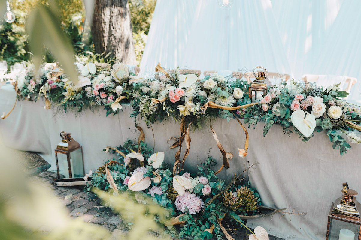 Our beautiful African landscapes and wild animals were part of the motivation for John and Jenny to bring all their guests from the Philippines, America and many other countries all the way to Cape Town for their wedding. Jenny wanted soft elegance, showcasing the protea and incorporating African animals in a stylish way. Her chosen colour scheme was blush, gold, off-white and grey and they wanted to tie in with the African Safari theme by moving guests from one location to the next for every part of the wedding day.