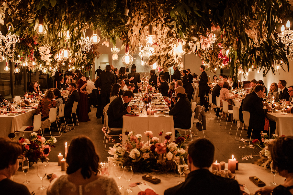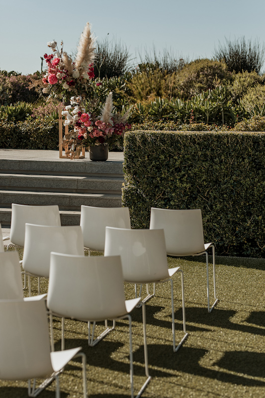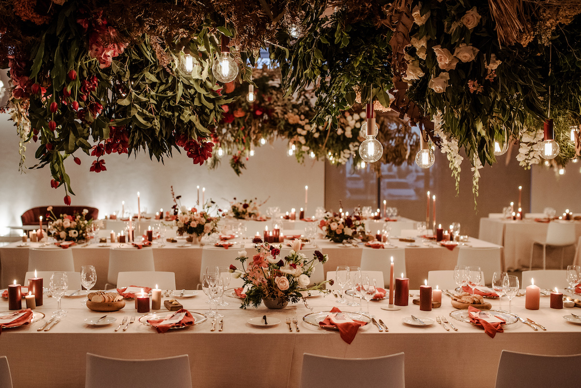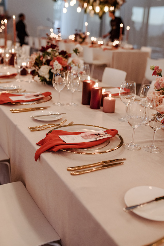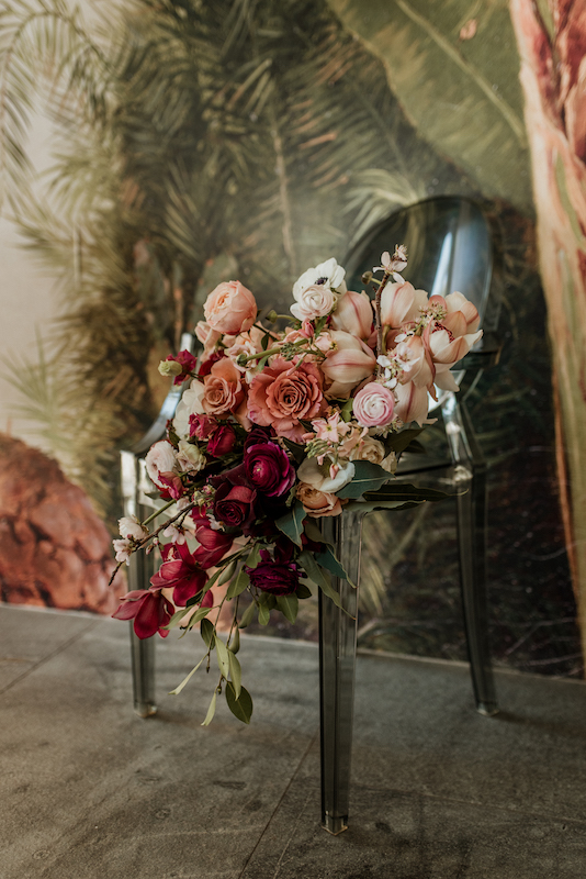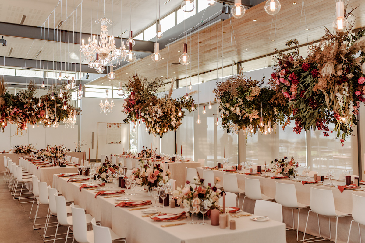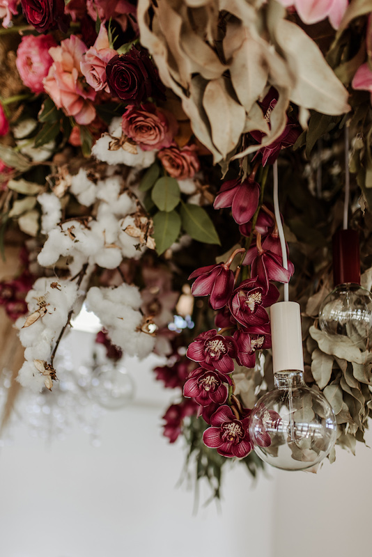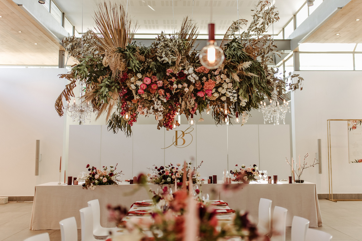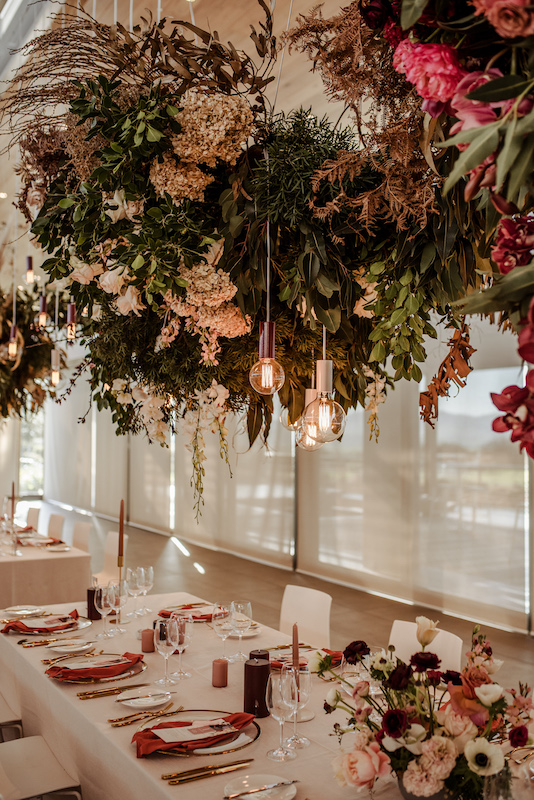 While Cavalli’s views are majestic, the venue itself is very modern. We used it as a blank canvas and by suspending massive floral installations incorporating the beautiful, rich colours and greenery, we created the look that they were after. Luxurious, rust napkins made a statement on the tables, while pillar candles in mocca and marsala added ambience along with more colour. Naked bulbs and chandeliers peeped out from among the suspended arrangements and even the cuffs on the bulbs echoed the theme.